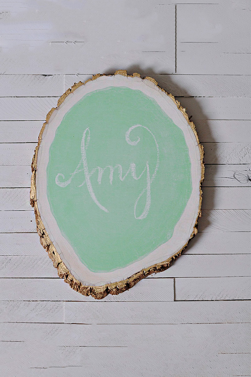 INSIDE : Learn how to make a stunning DIY Tree Stump Chalkboard! This easy tutorial for a Wood Slice Chalkboard uses a natural tree slice, mint colored chalkboard paint, and gold accents for a unique look.
